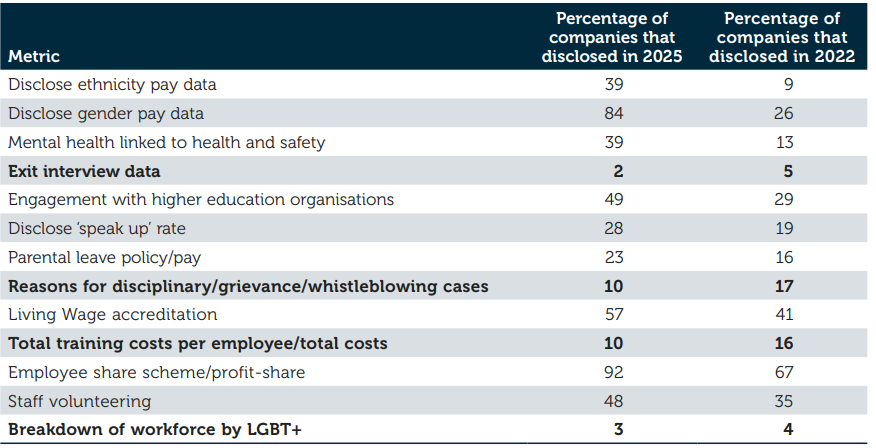 - Regulators: The FRC should consider providing clearer guidance to improve the consistency and comparability of workforce reporting under the UK Corporate Governance Code. This would help ensure more meaningful data and narrative, making it easier for stakeholders to interpret disclosures and enhancing comparability between companies.